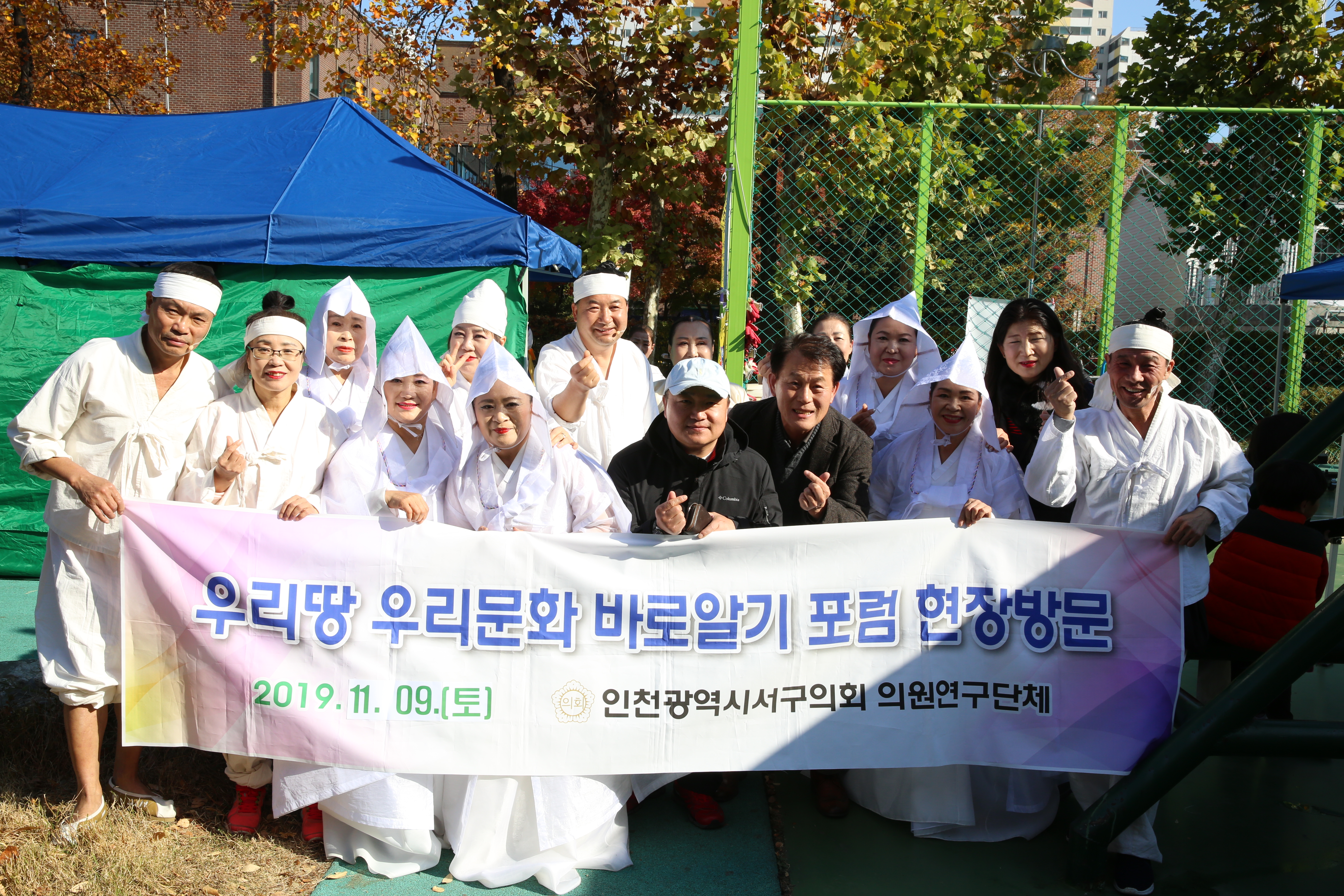 인천광역시 서구의회 의원연구단체 ‘우리땅 우리문화 바로알기 포럼’(대표자 심우창)이 지난 11월 9일 석남체육공원에서 개최된 해설이 있는 무대 2019년 구민과 함께하는 문화재 체험 ‘시무형문화재 제18호 서곶들노래’에 참석하여 공연을 관람하고 서구의 향토문화를 직접 체험하였다.