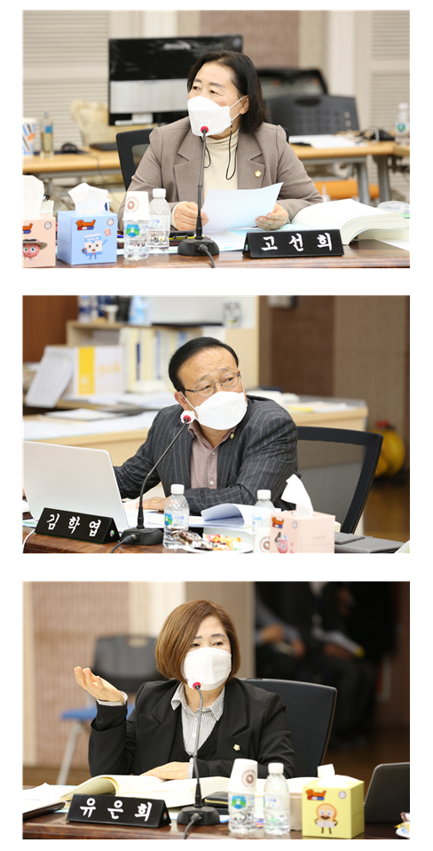 고선희 의원은 상생마을 복합커뮤니티센터와 관련하여 “완공한지 얼마 안 된 복합커뮤니티센터 건물에 폭우 시 물이 들어와 나무바닥이 망가졌다. 또한 건물 내·외부 바닥을 구분하는 턱이 없고 배수로가 제대로 설계되지 않아 비가 오면 같은 문제가 반복될 우려가 있다”고 지적하며 “설계상의 문제점을 조사하여 조치방안을 마련하고, 하자 보수 진행 관련 자료를 제출해 줄 것”을 요청했다.