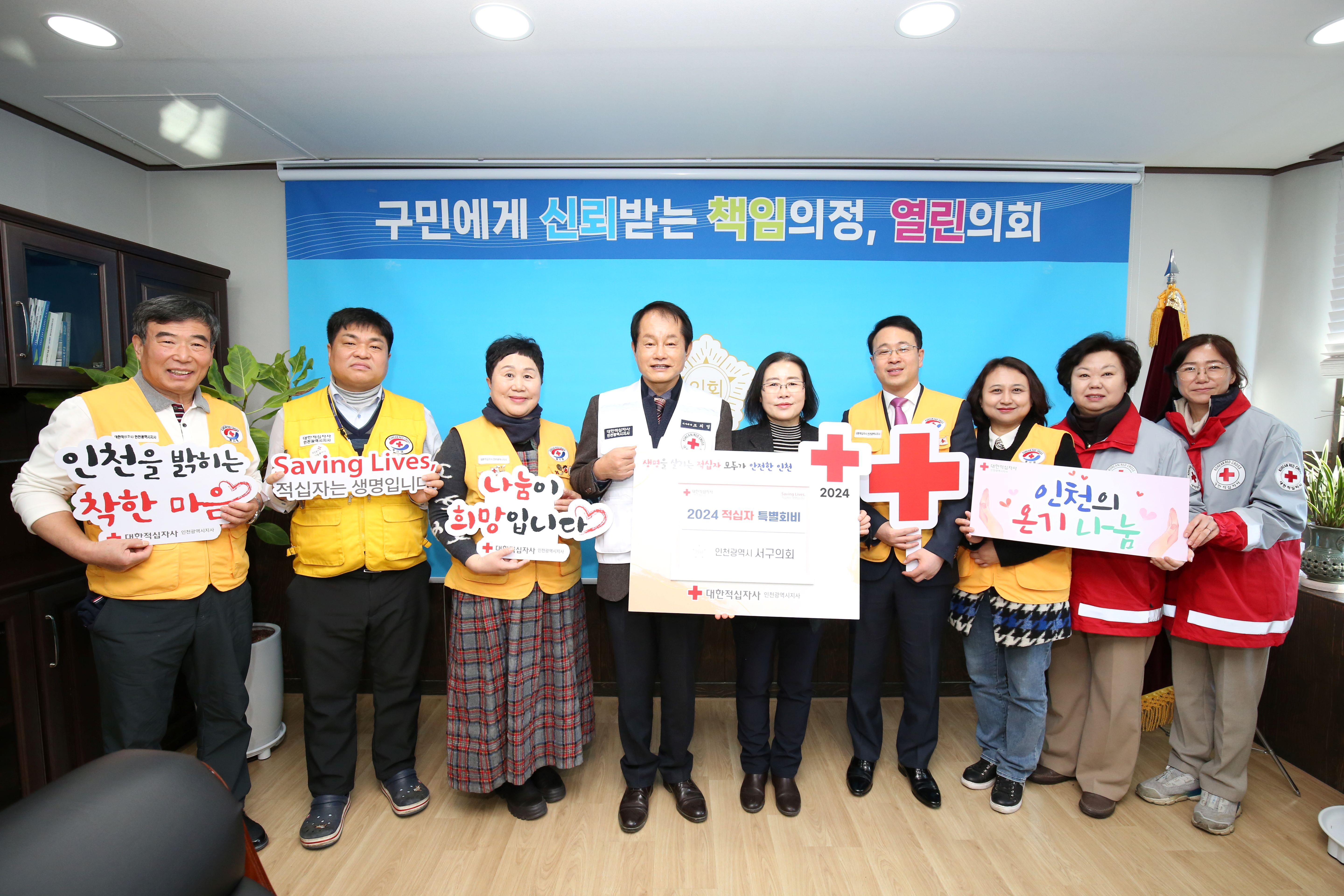 인천 서구의회(의장 고선희)가 23일 대한적십자사 인천지사에 2024년 적십자 특별회비를 전달하고 따뜻한 나눔문화 확산에 동참했다.