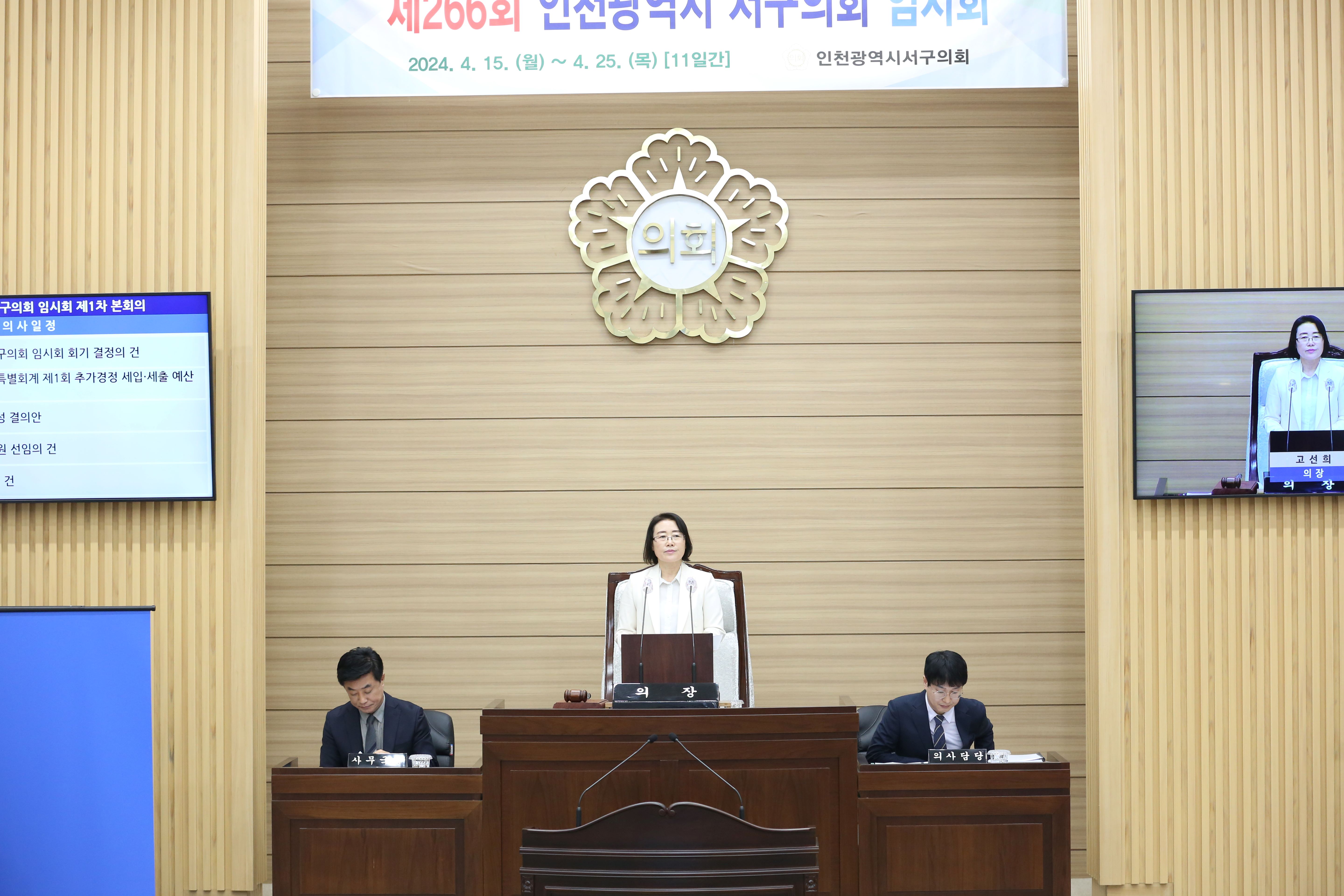 인천 서구의회(의장 고선희)가 15일 제266회 임시회 개회식과 제1차 본회의를 열고 총 11일간의 의사일정을 시작했다.