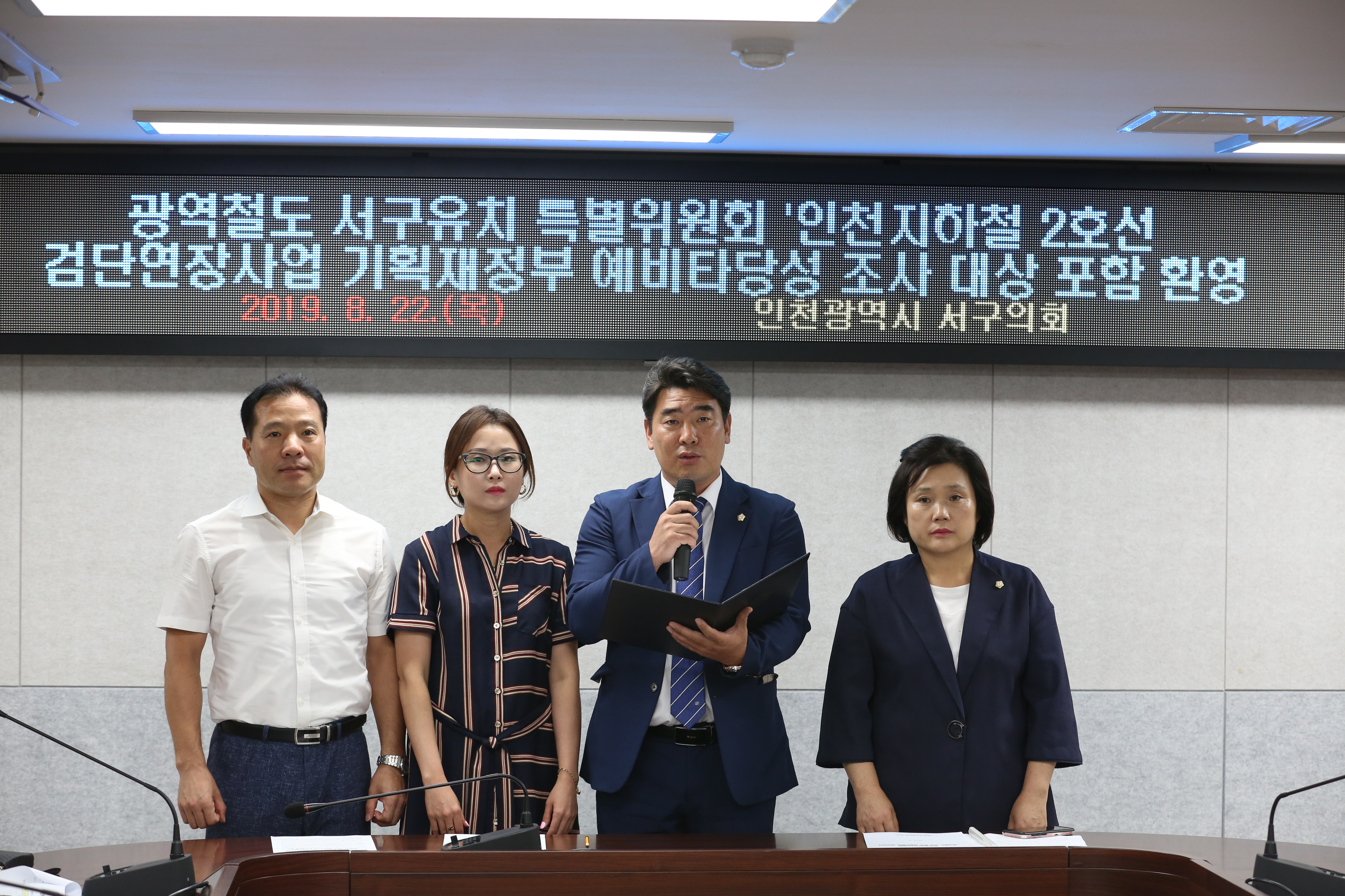 (심우창, 이의상, 최은순, 김이경) “인천지하철 2호선 검단연장사업은 신도시 지역과 기존 원도심을 아우르는 교통대책이며, 나아가 김포와 일산까지 연결되는 광역철도로써 서구 주민들이 GTX A노선을보다 편리하게 이용할 수 있는 획기적 사업”이라며 “이번 기획재정부의 예비타당성 조사 대상 선정을 55만 서구 주민과 함께 열열히 환영한다”고 밝혔다.