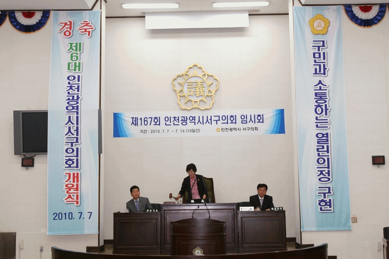 2010.7.7일 인천광역시 서구의회는 제167회 임시회를 개최하고 의원 투표를 통하여 의장(김영옥 의원) 및 부의장(정일우 의원)을 선출하였다.