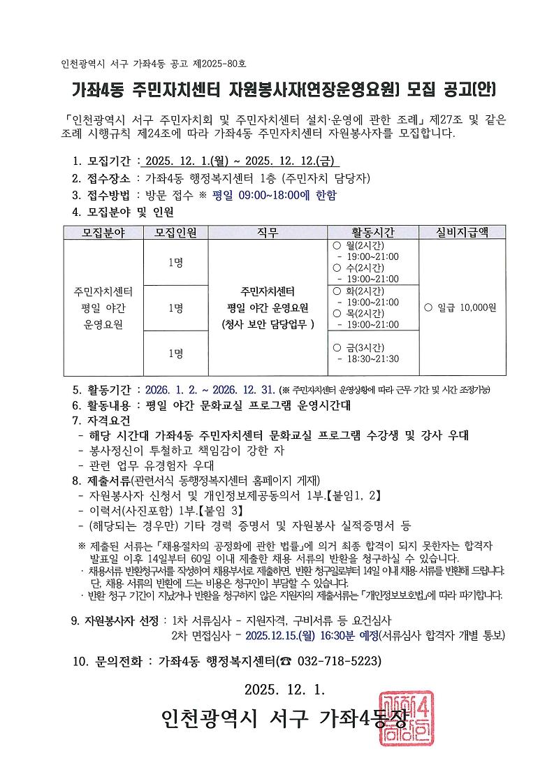 가좌4동 주민자치센터 자원봉사자(연장운영요원) 공개모집 공고