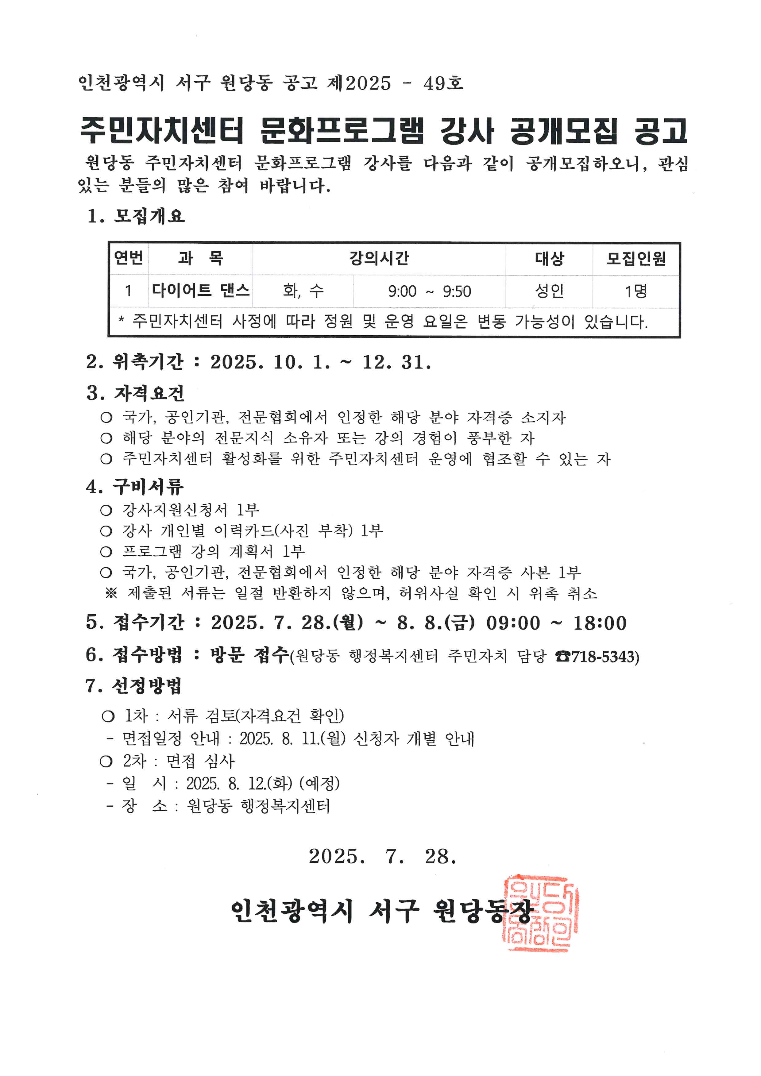 2025년 원당동 주민자치센터 문화프로그램 강사 모집 공고(다이어트 댄스)
