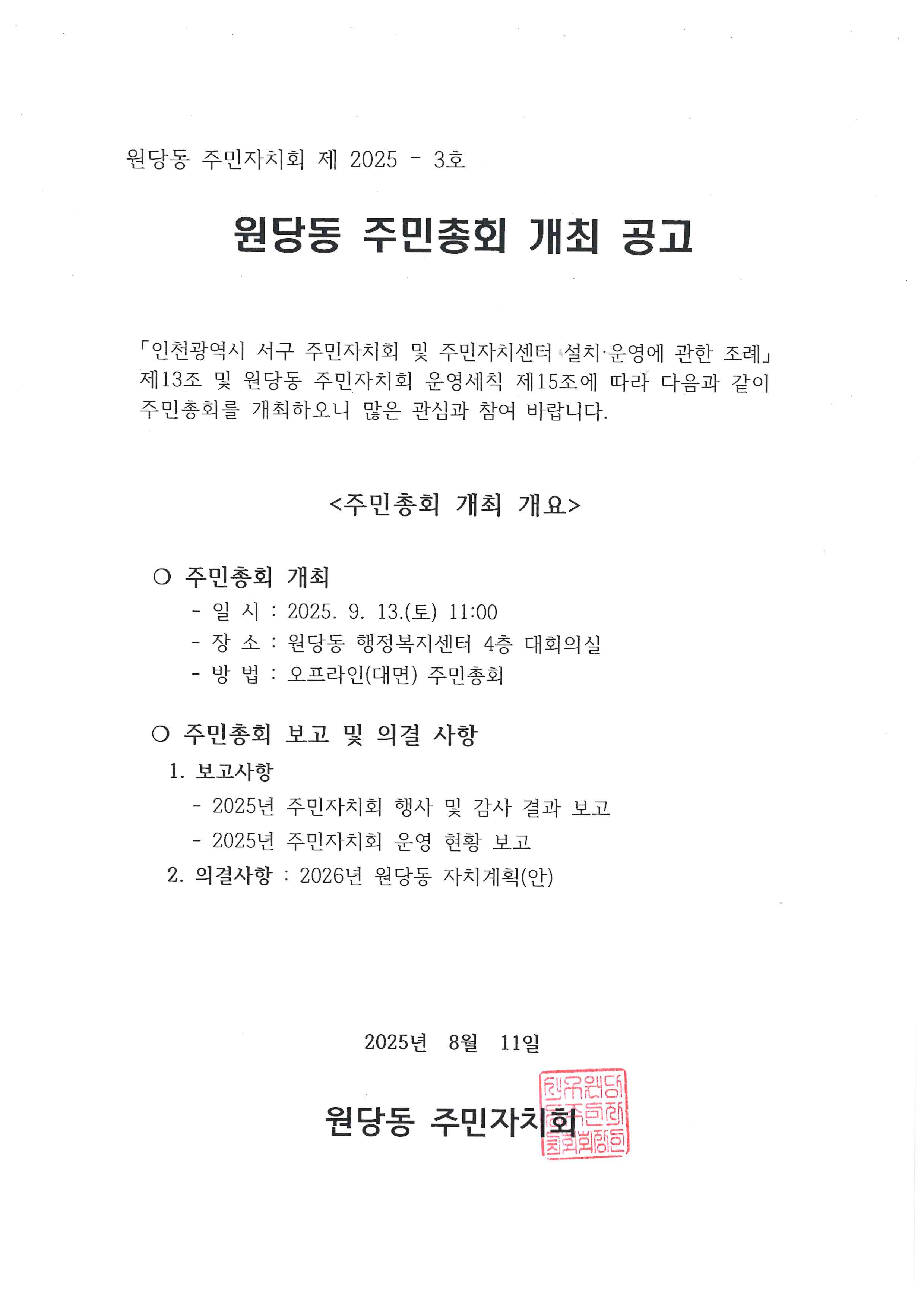 2025년 제5회 원당동 주민총회 개최 공고