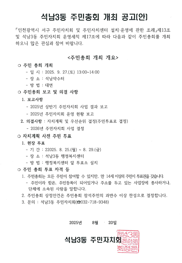 석남3동 주민총회 개최 공고