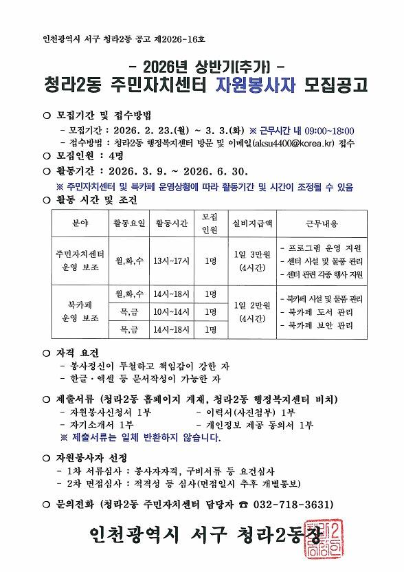 2026년 상반기(추가) 청라2동 주민자치센터 및 북카페 자원봉사자 모집 공고