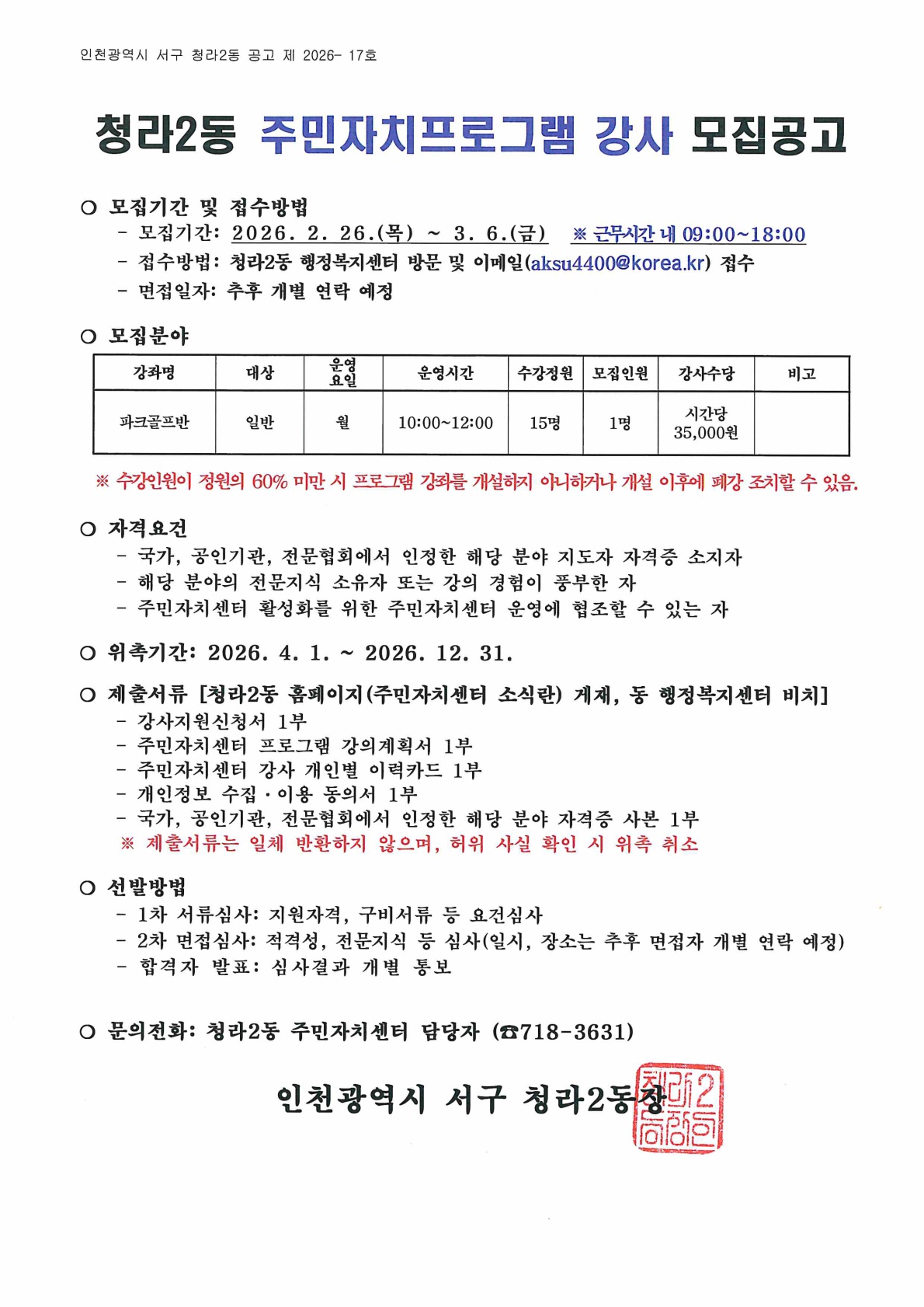 청라2동 주민자치프로그램 강사 모집 공고(파크골프)