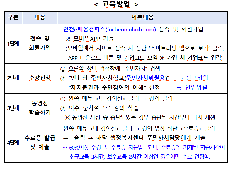 - 교육방법 : 인천e배움캠퍼스 회원가입 후 개별신청(모바일 가능)