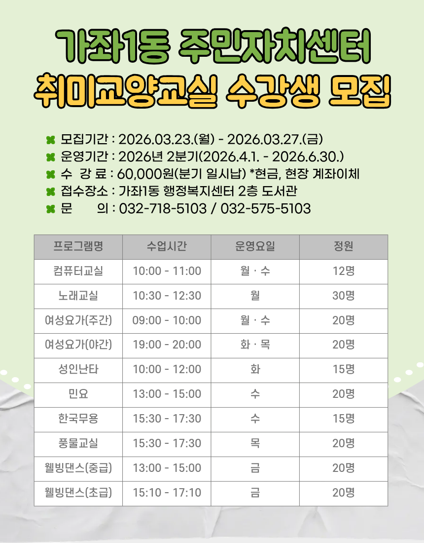 2026년 2분기 가좌1동 주민자치센터 프로그램 수강생 모집 공고
