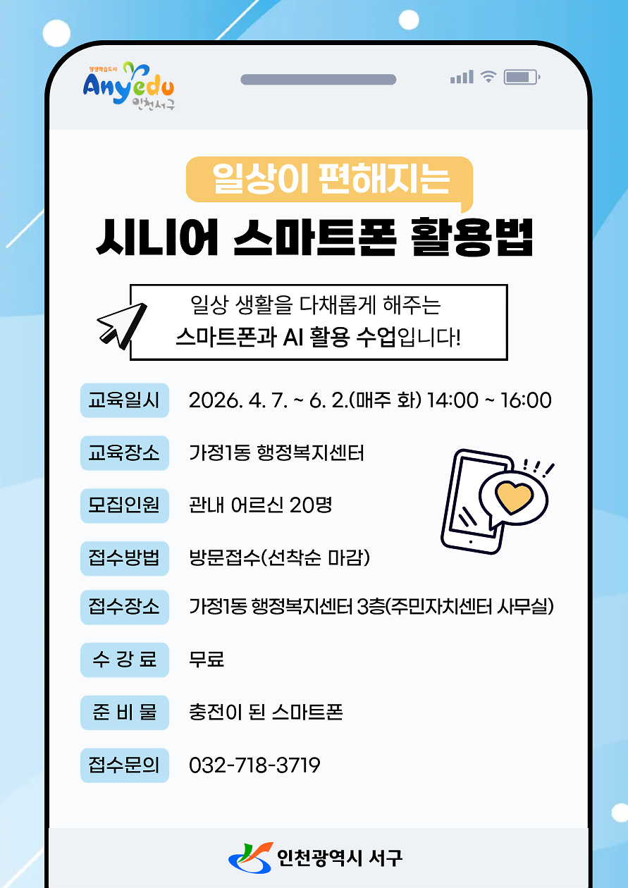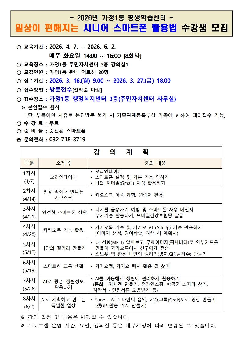 가정1동 평생학습프로그램 「일상이 편해지는 시니어 스마트폰 활용법」 수강생 모집 안내