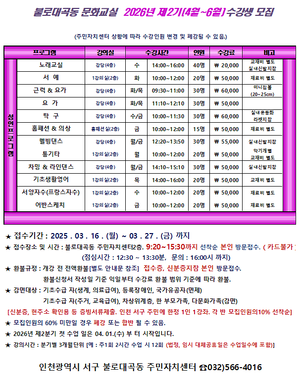 2026년 제 2기 (4월~6월) 불로대곡동 주민자치센터 문화교실 프로그램 모집 안내 입니다.