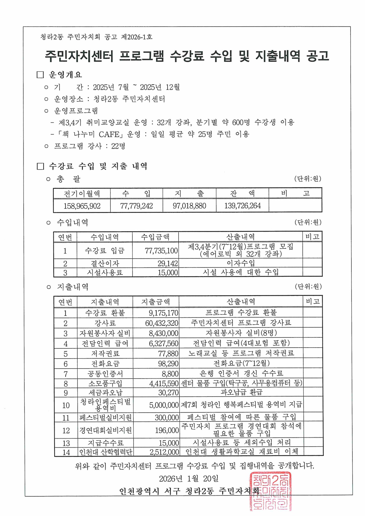 2025년 하반기 청라2동 주민자치센터 프로그램 수강료 수입 및 지출내역 공고