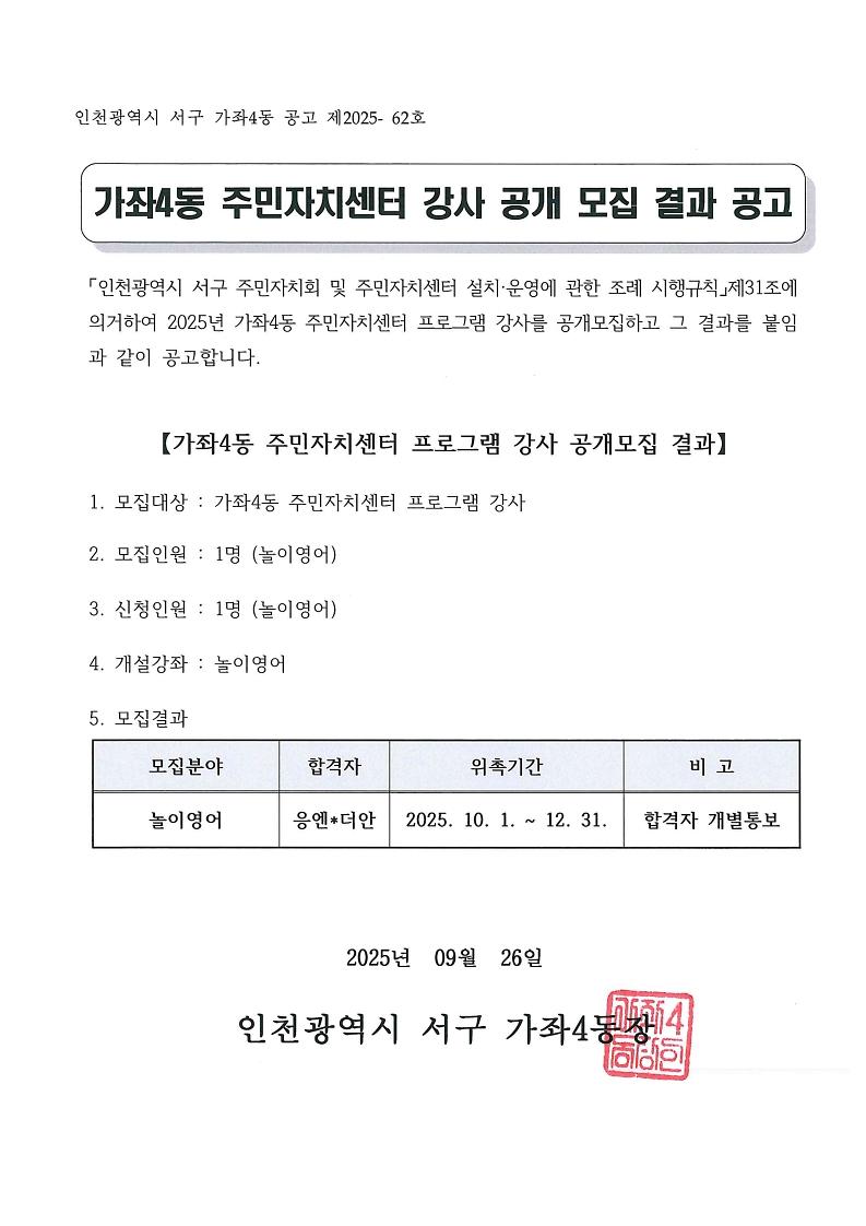 가좌4동 주민자치센터 문화교실 프로그램 강사 공개 모집 결과 공고