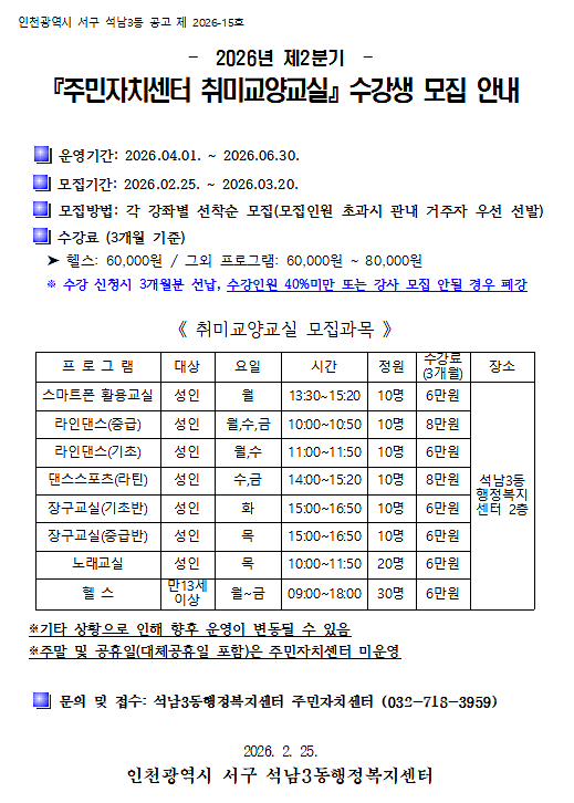 2026년도 2분기 석남3동 취미교양교실 수강생 모집공고문
