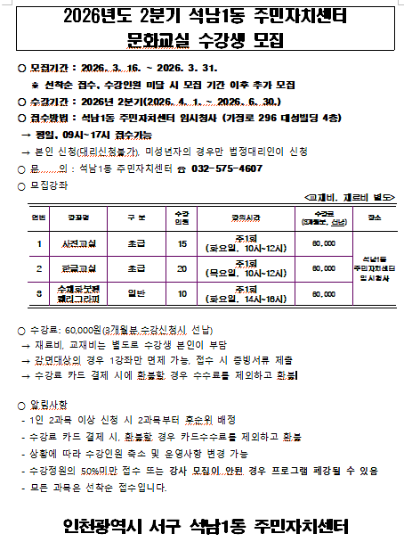 2026년도 2분기 석남1동 주민자치센터 문화교실 수강생 모집