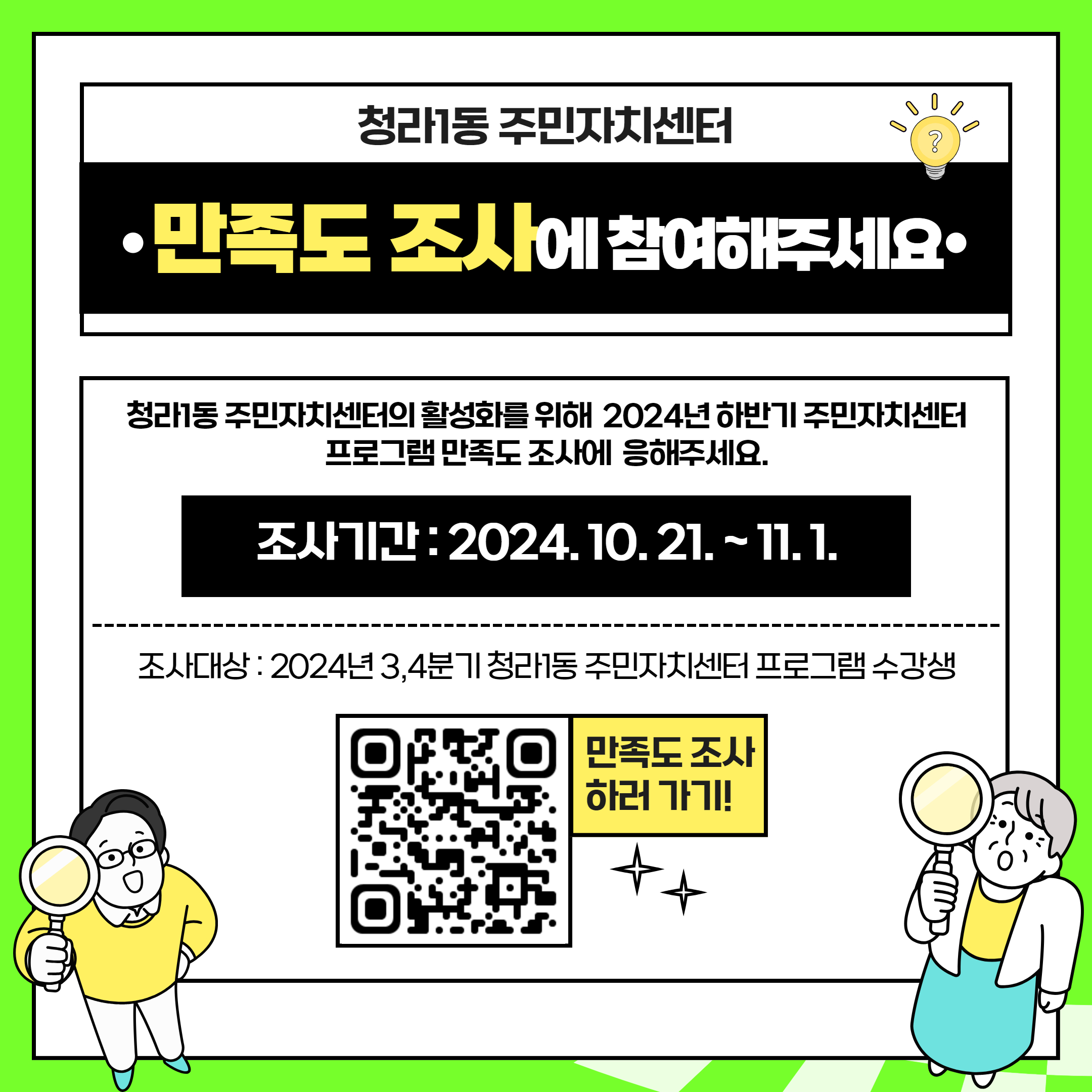 청라1동 주민자치센터의 활성화를 위해 2024년 하반기 주민자치센터 프로그램 만족도 조사를 실시합니다.