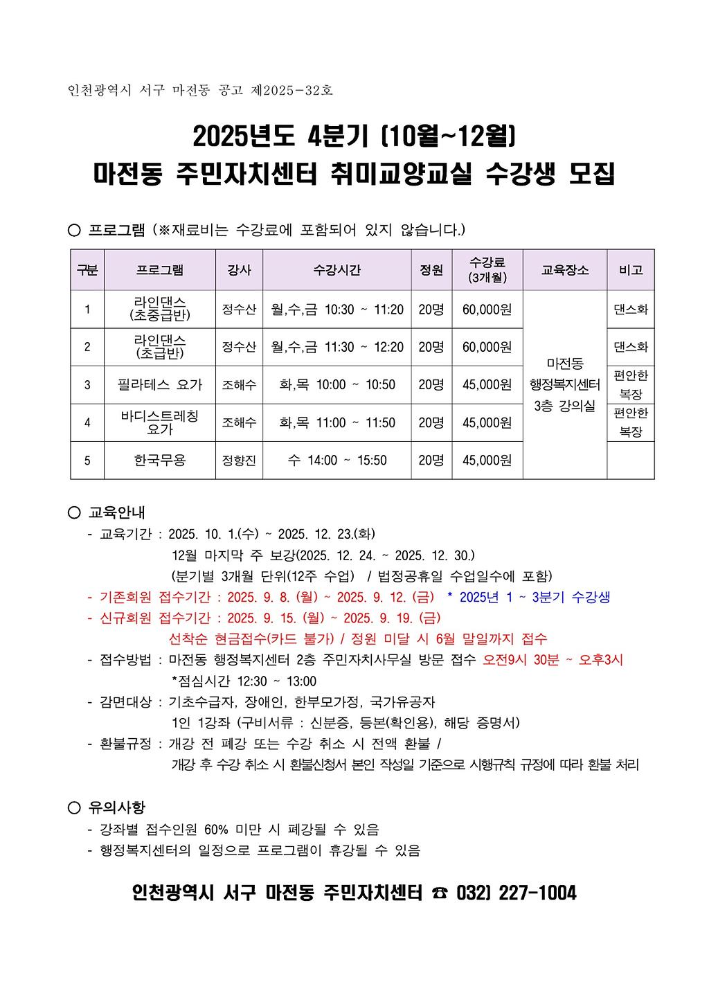 2025년 4분기 마전동 주민자치센터 취미교양교실 수강생 모집