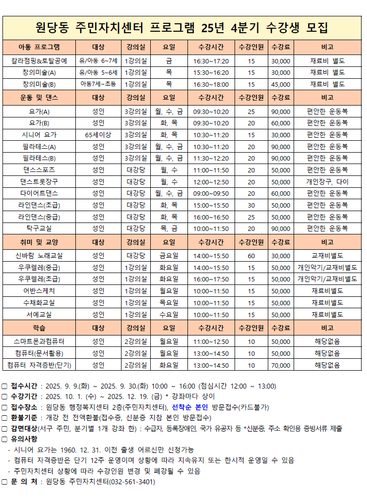 원당동 주민자치센터 문화프로그램 2025년 4분기 수강생 모집 안내
