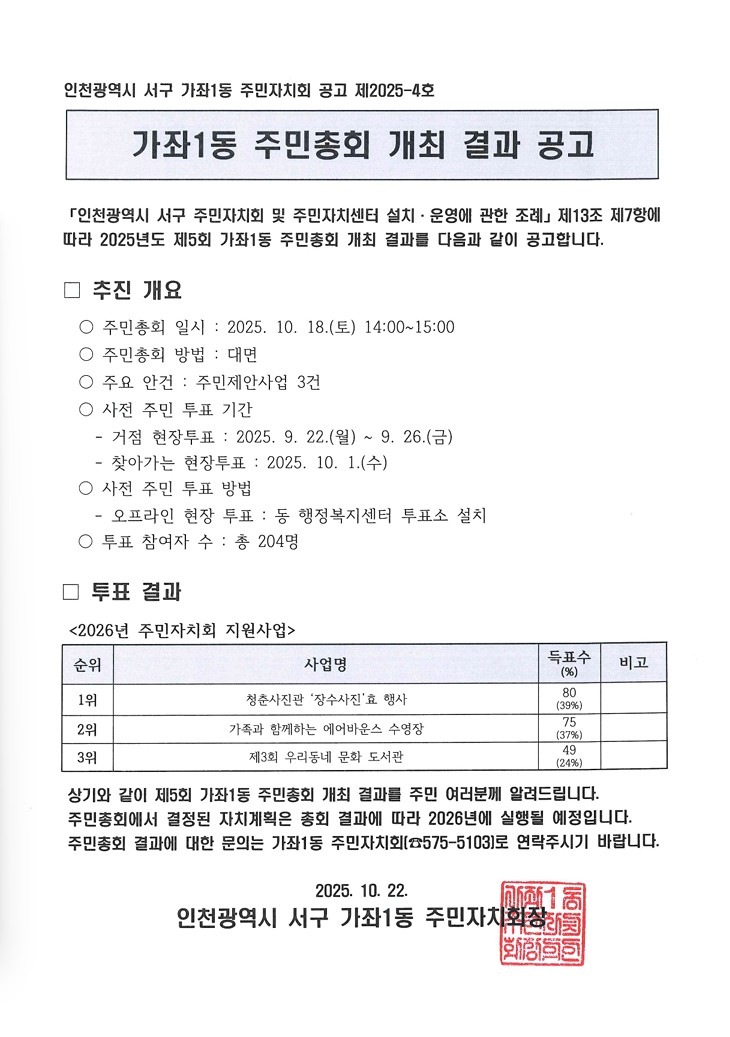 2025년 제5회 가좌1동 주민총회 개최 결과 공고