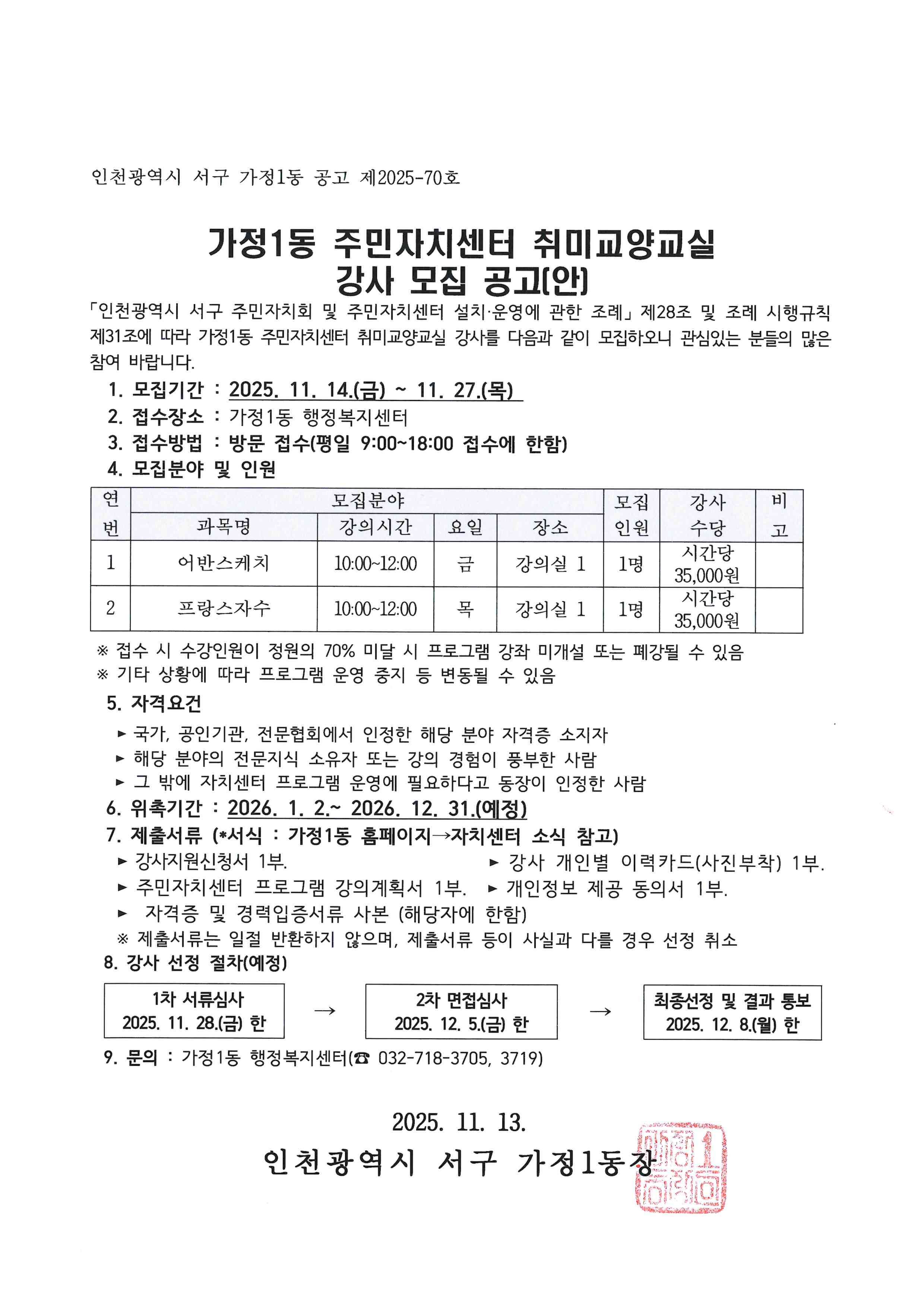 2026년 가정1동 주민자치센터 취미교양교실(어반스케치, 프랑스자수) 강사 모집 공고