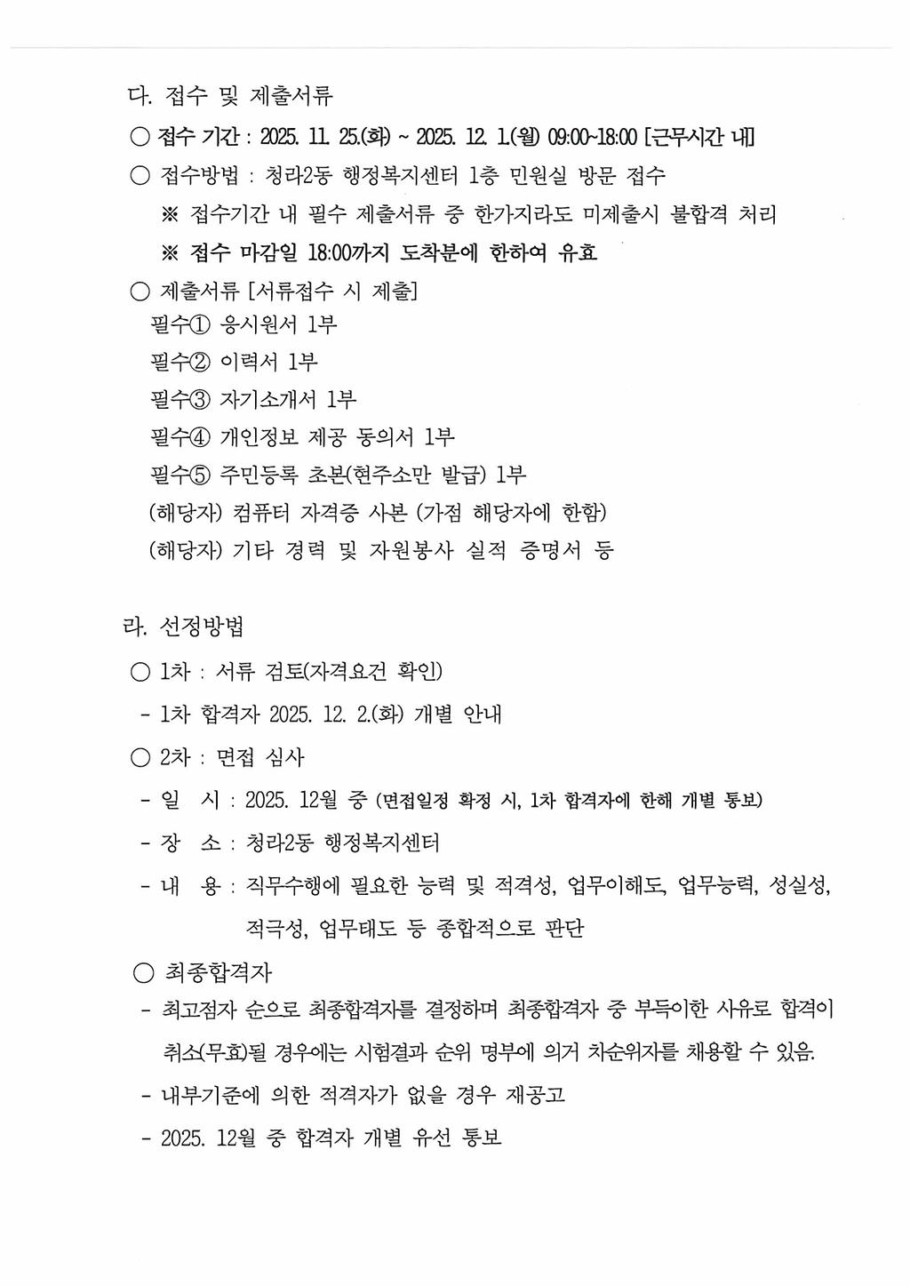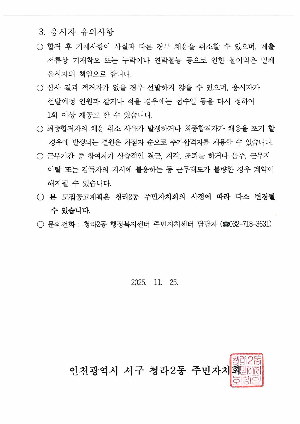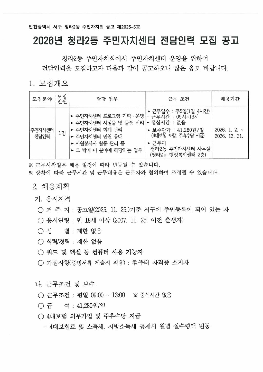 2026년 청라2동 주민자치센터 전담인력 모집 공고