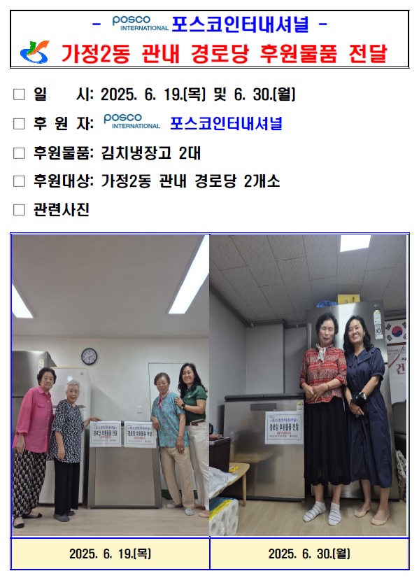 "포스코 인터내셔널" 가정2동 관내 경로당 후원물품 전달