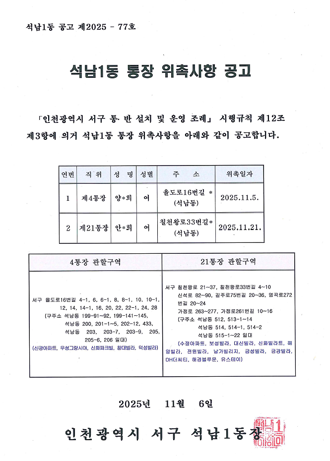 석남1동 통장 위촉사항 공고(4,21통)