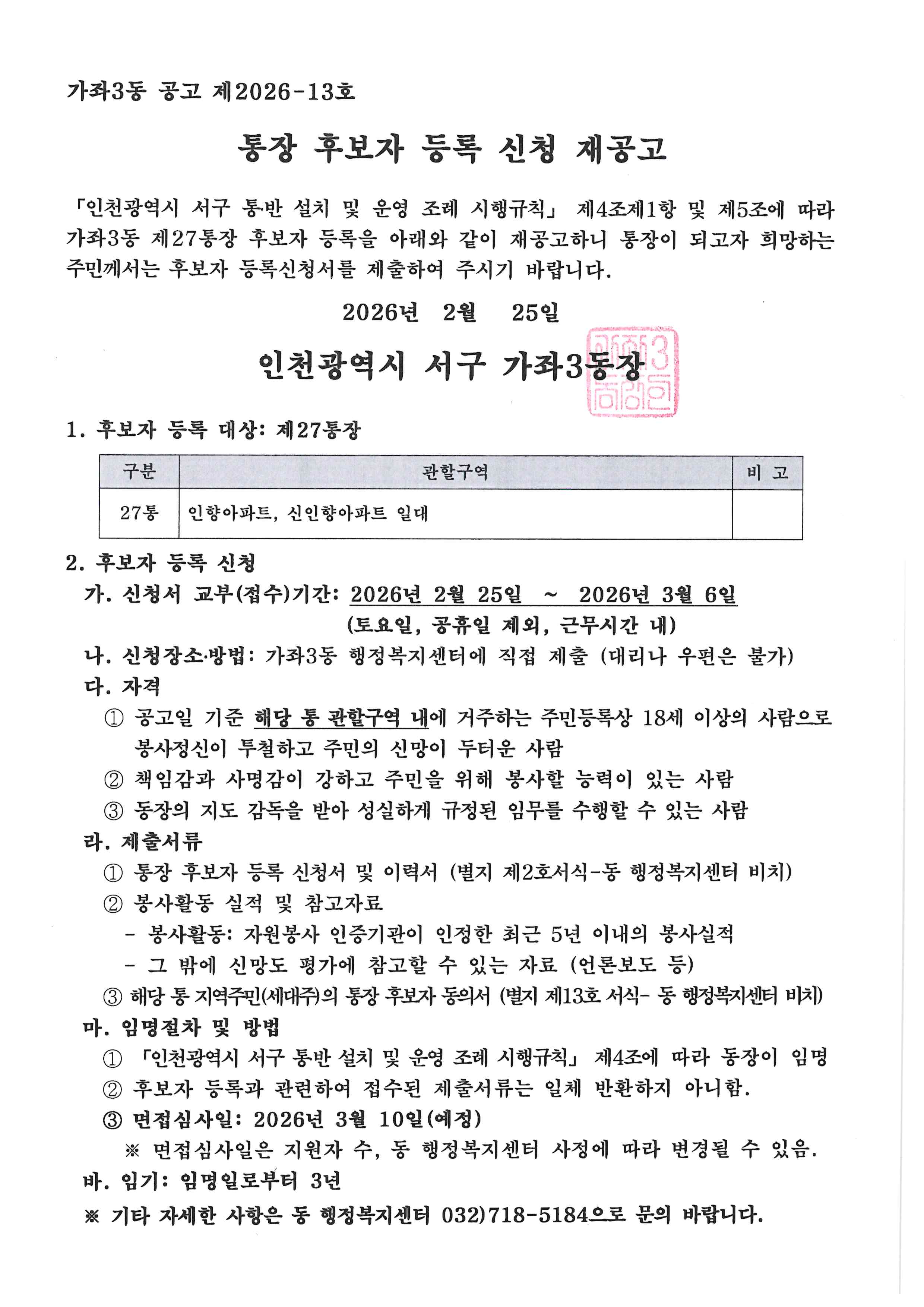 「인천광역시 서구 통·반 설치 및 운영 조례 시행규칙」제4조제1항 및 제5조에 따라 가좌3동 27통장 공개모집을 아래와 같이 재공고하고자 합니다.