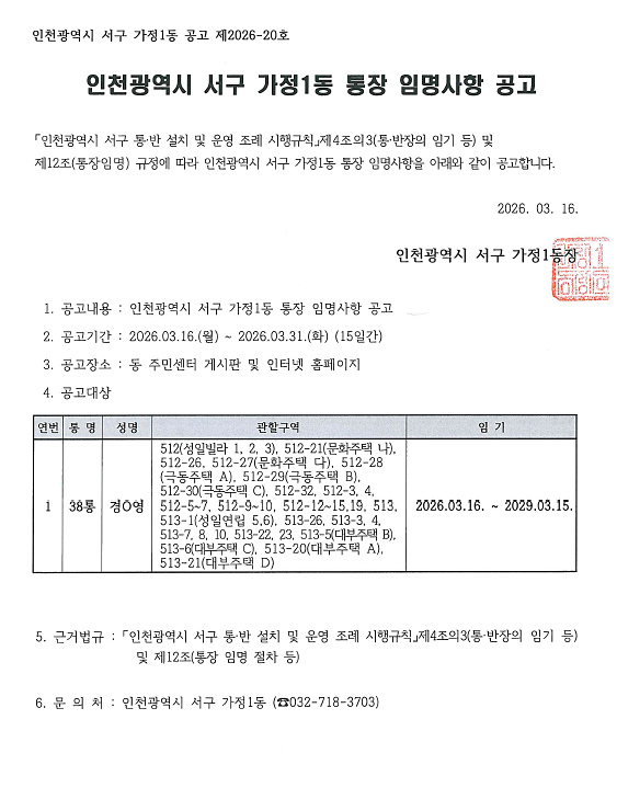 가정1동 통장 임명사항 공고(제38통)