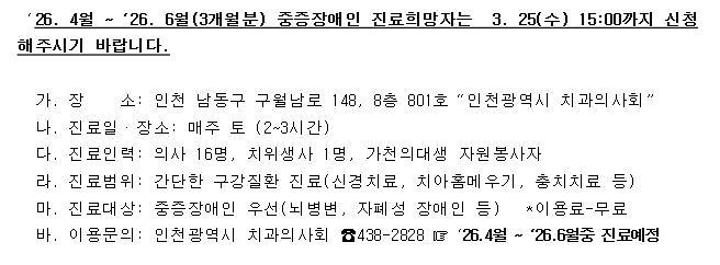 2026년 4월~6월 장애인 무료치과진료 안내
