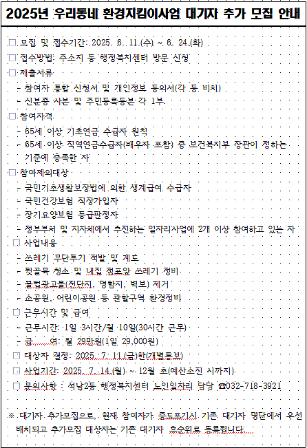 2025년 우리동네 환경지킴이 참여자 (대기자)추가모집 안내