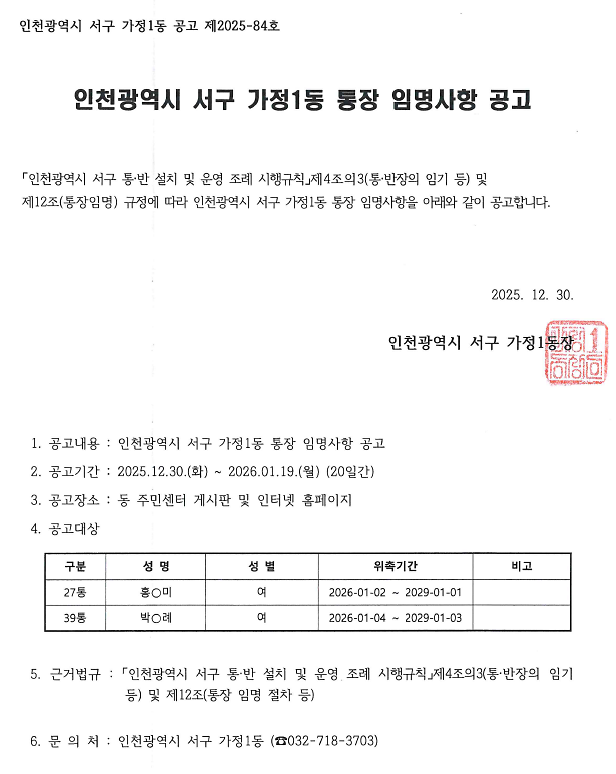 가정1동 통장 임명사항 공고(제27,39통)
