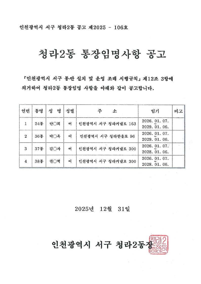 청라2동 통장 임명사항 공고(24, 36, 37, 38통)