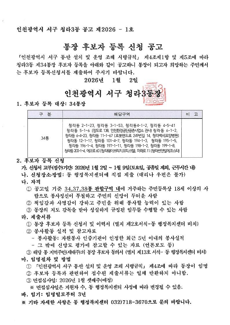 청라3동 통장 공개모집 재공고(34통)