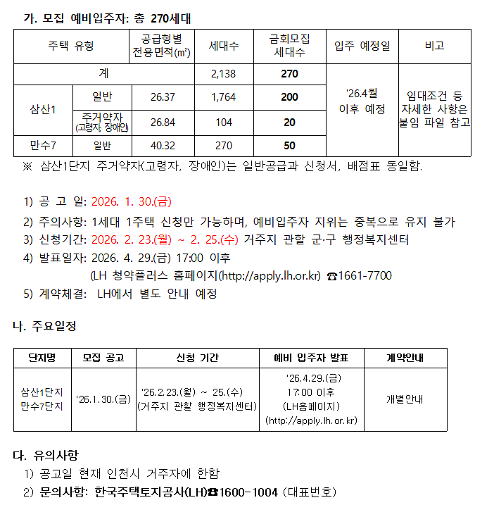 영구임대주택(삼산1단지,만수7단지) 예비입주자 모집 안내