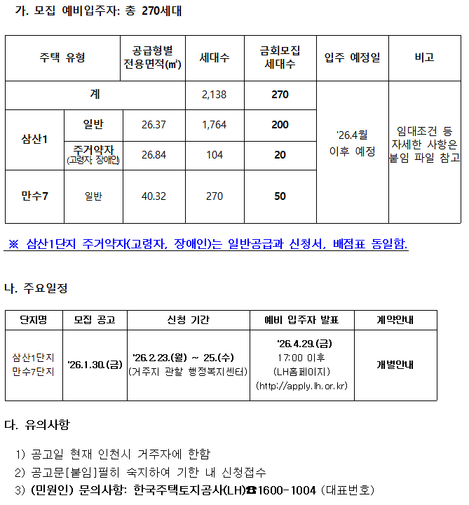영구임대주택(삼산1단지,만수7단지) 예비입주자 모집 안내