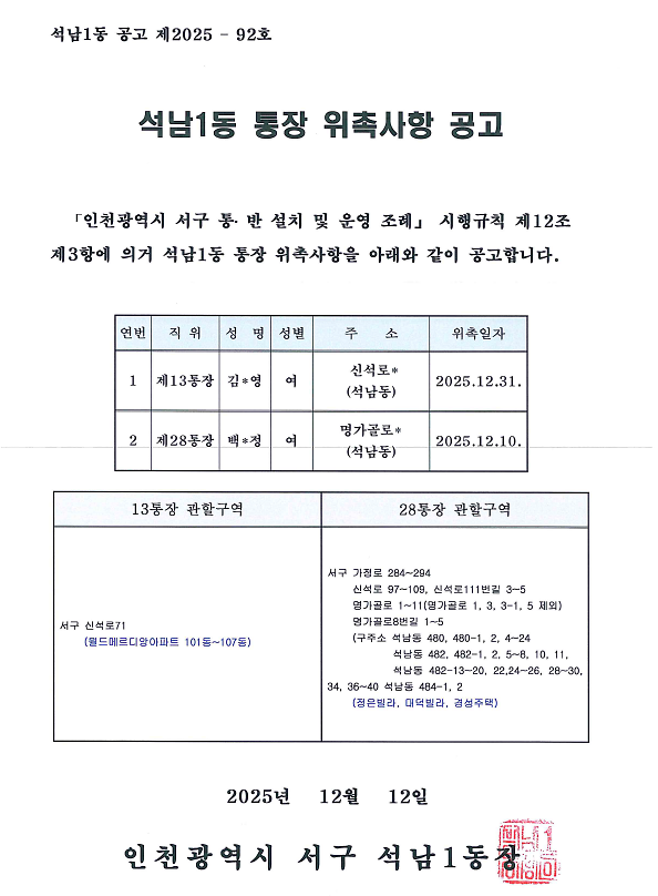 석남1동 제 13통, 28통 임명사항 공고