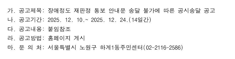 장애정도 재판정 통보 안내문 송달 불가에 따른 공시송달 공고(하계1동)