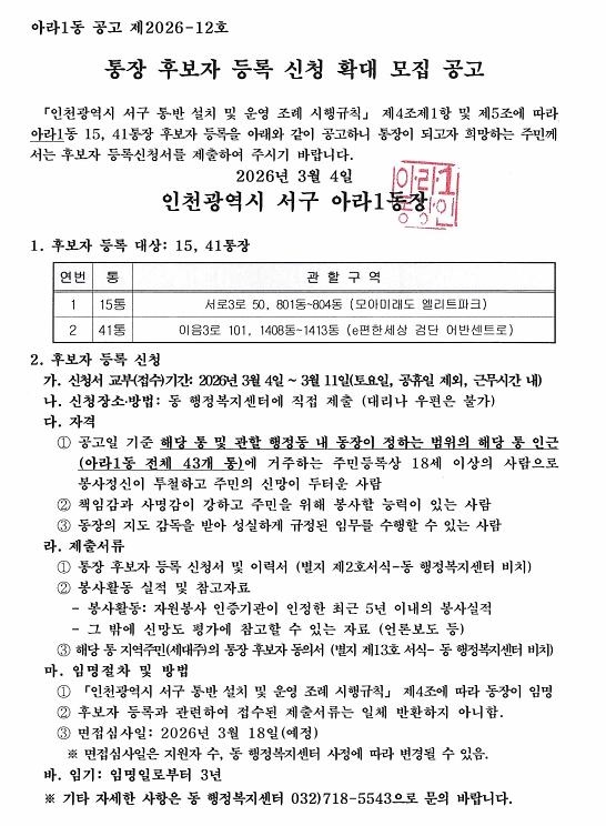 15통, 41통장 공개모집을 확대 공고합니다.
