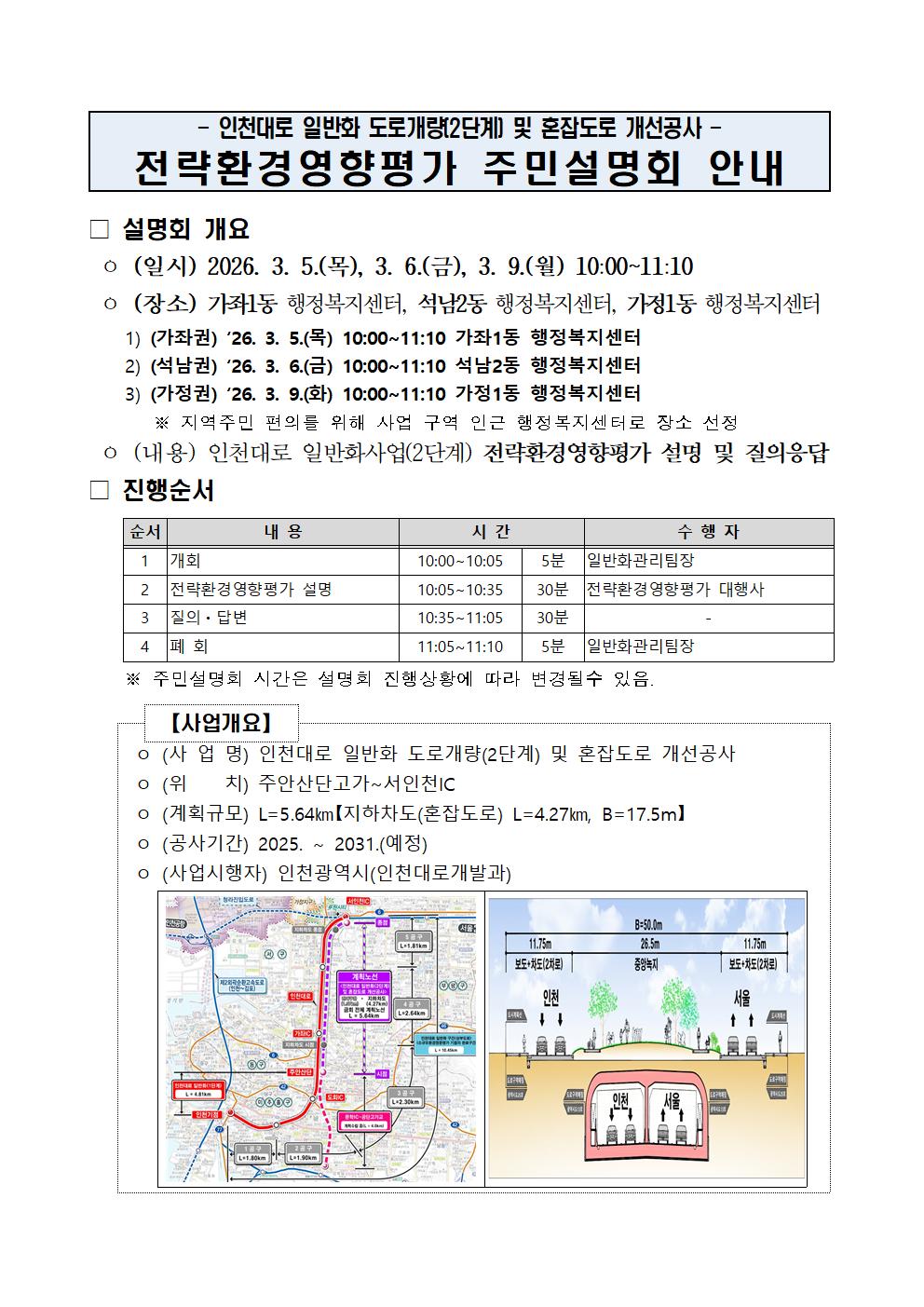 인천대로 일반화 도로개량(2단계) 및 혼잡도로 개선공사 전략영향평가 주민설명회 안내드리니 주민 여러분의 많은 참여와 관심 부탁드립니다.