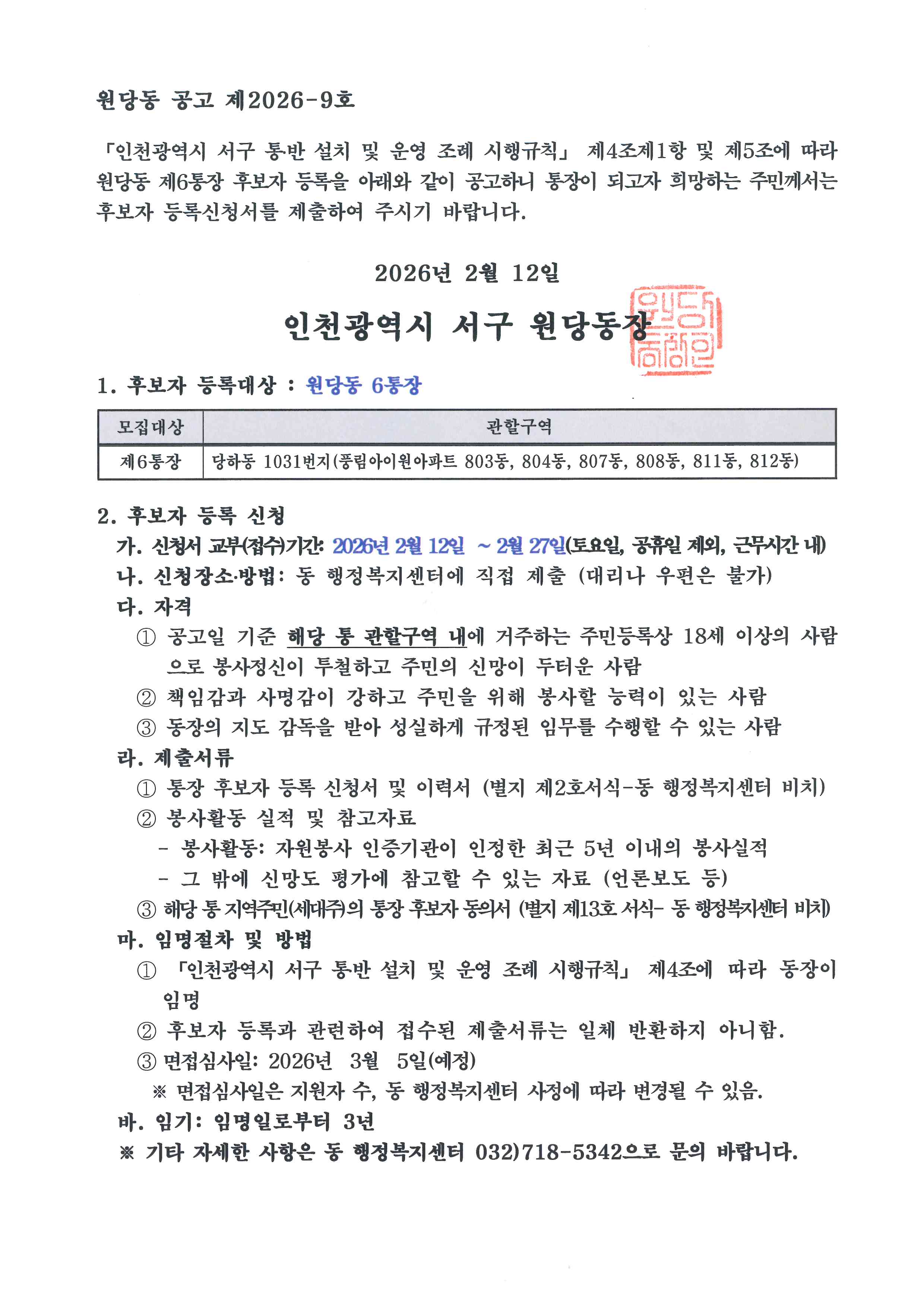 원당동 6통장 후보자 등록을 아래와 같이 공고하오니