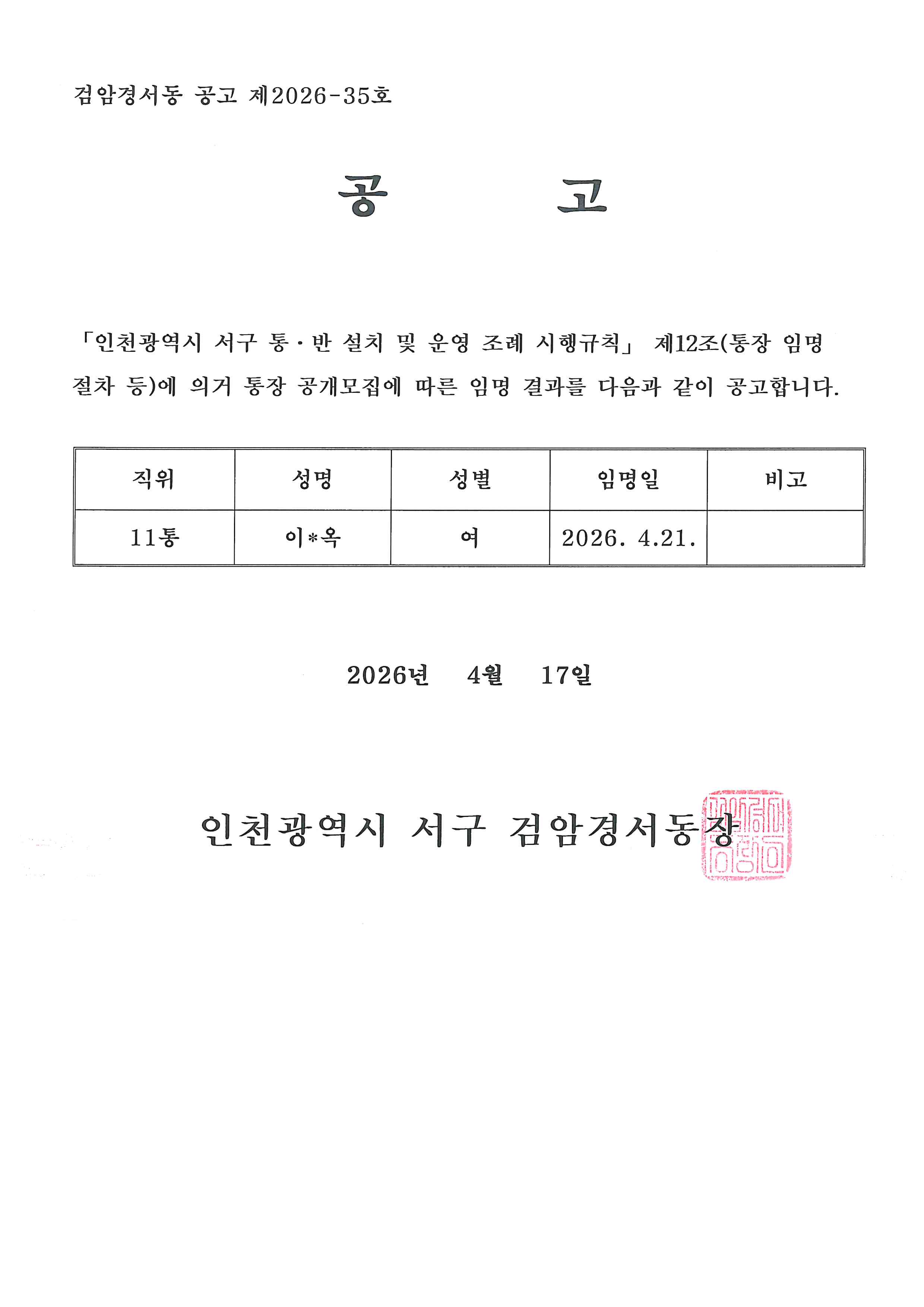 검암경서동 통장임명사항 공고(11통)