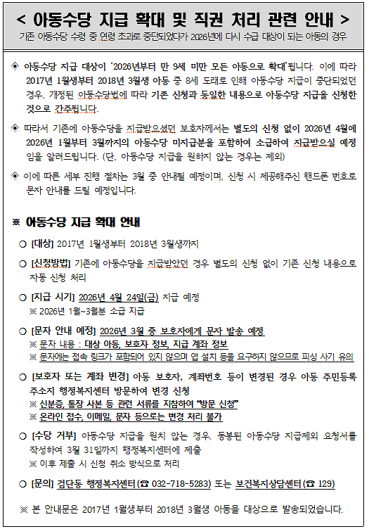 아동수당 지급 확대 및 직권 처리 관련 안내(17년 1월~18년 3월생)
