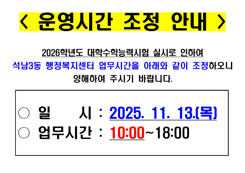 석남3동 행정복지센터 업무시간 조정 안내(11.13.목 10:00~18:00)