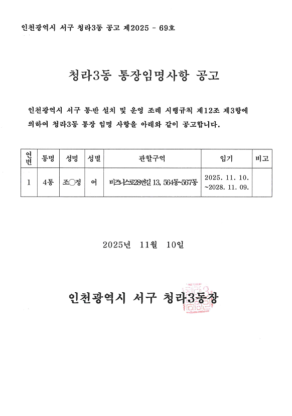 청라3동 제4통장 임명사항 공고