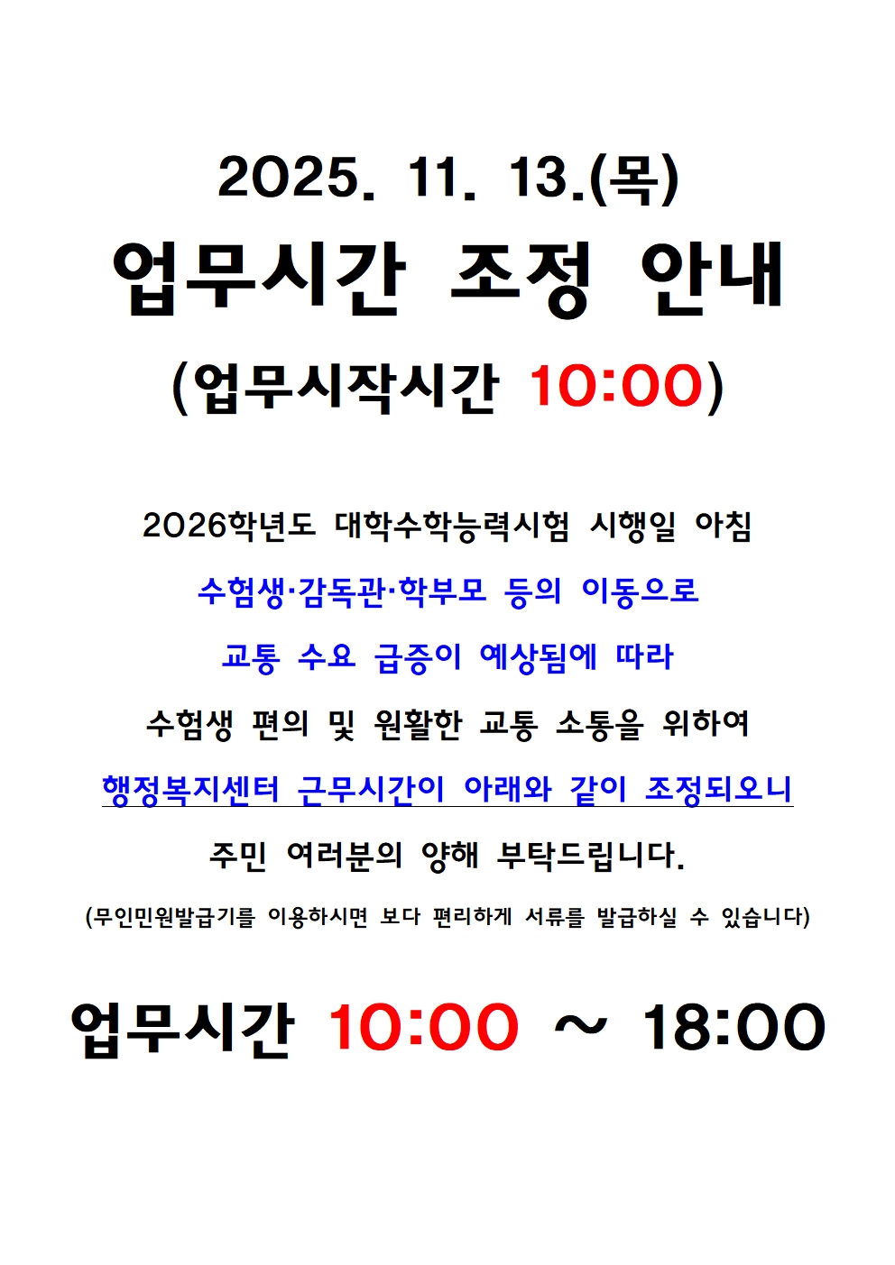 2026학년도 대학수학능력시험 시행에 따른 업무시간 조정 안내(10:00~18:00)