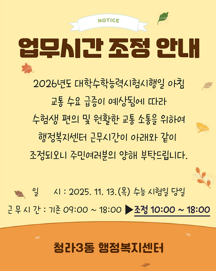 2026학년도 대학수학능력시험 시행에 따른 업무시간 조정 안내(10:00~18:00)