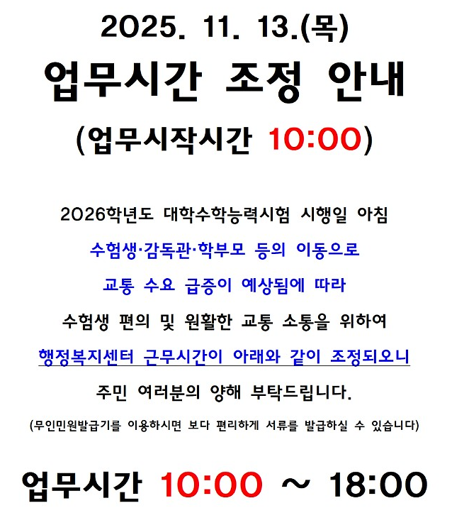 2026학년도 대학수학능력시험 시행에 따른 업무시간 조정 안내(10:00~18:00)