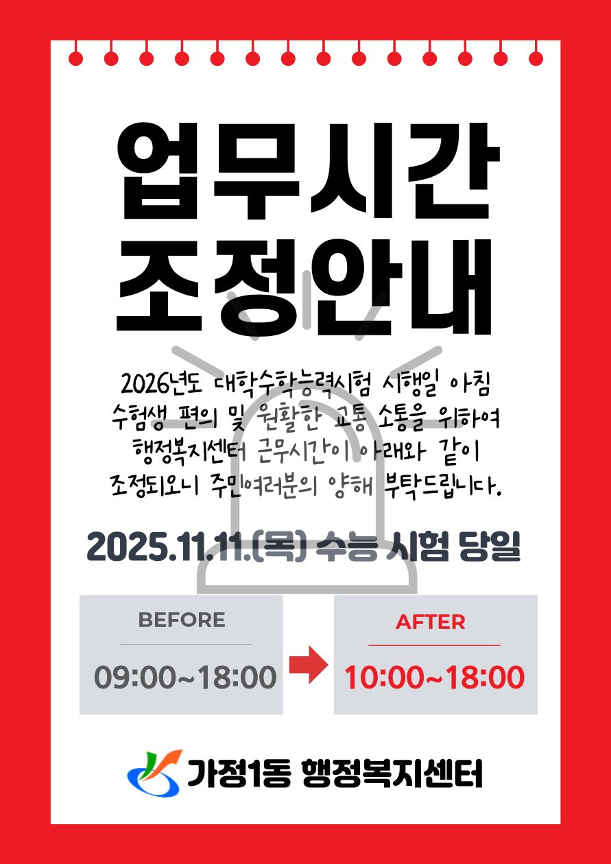 11.13.(목) 2026학년도 대학수학능력시험 시행에 따른 가정1동 행정복지센터 운영시간 조정 안내(10:00~18:00)
